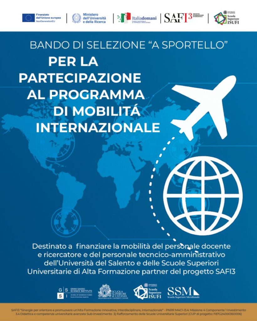 ll Progetto SAFI3 – Sinergie per orientare e promuovere un’Alta formazione Innovativa, Interdisciplinare e Internazionale, finanziato dal PNRR, promuove un bando dedicato alla mobilità internazionale rivolto al personale docente, ricercatore e tecnico-amministrativo dell’Università del Salento e delle Scuole Superiori Universitarie di Alta Formazione partner del progetto (GSSI – Gran Sasso Science Institute, Scuola Superiore di Catania, Scuola Superiore ISUFI e Scuola Superiore Meridionale).