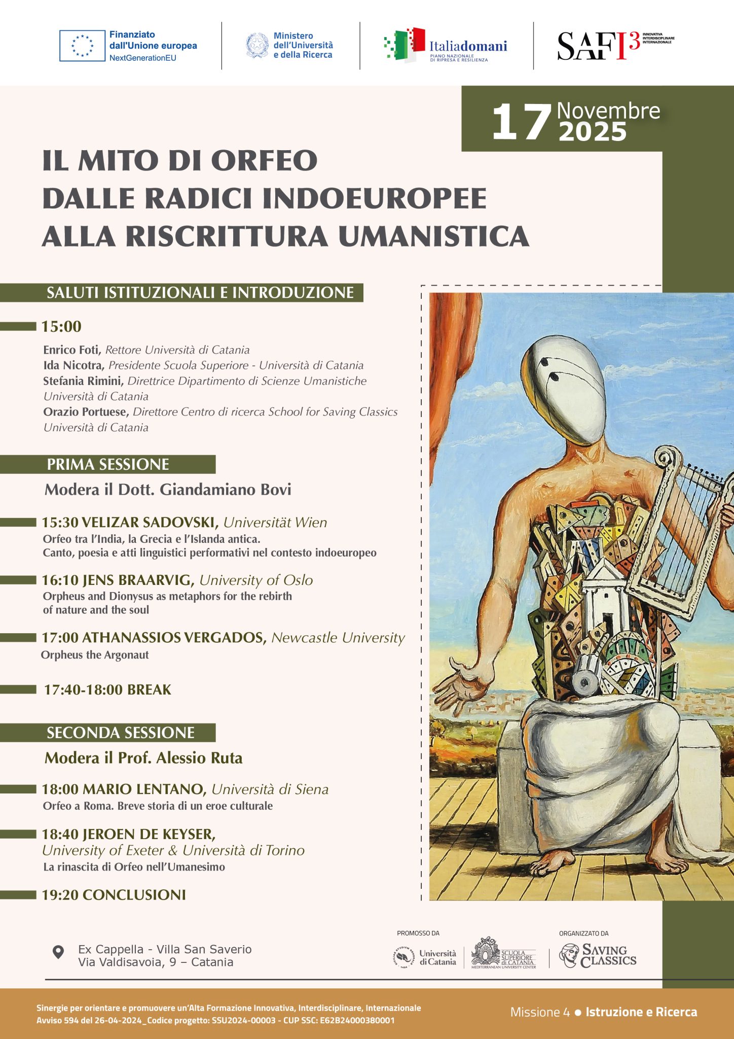 Una tavola rotonda dal titolo “Il mito di Orfeo dalle radici indoeuropee alla riscrittura umanistica”, organizzata da Orazio Portuese, professore associato di Lingua e letteratura latina presso l’Università di Catania. L’evento inaugura i lavori della School for Saving Classics (SSCl), centro di ricerca interdipartimentale dell’Università degli Studi di Catania, istituito con l’obiettivo di rilanciare la centralità della cultura classica greca e latina e valorizzare la sua influenza dal Medioevo ai giorni nostri.