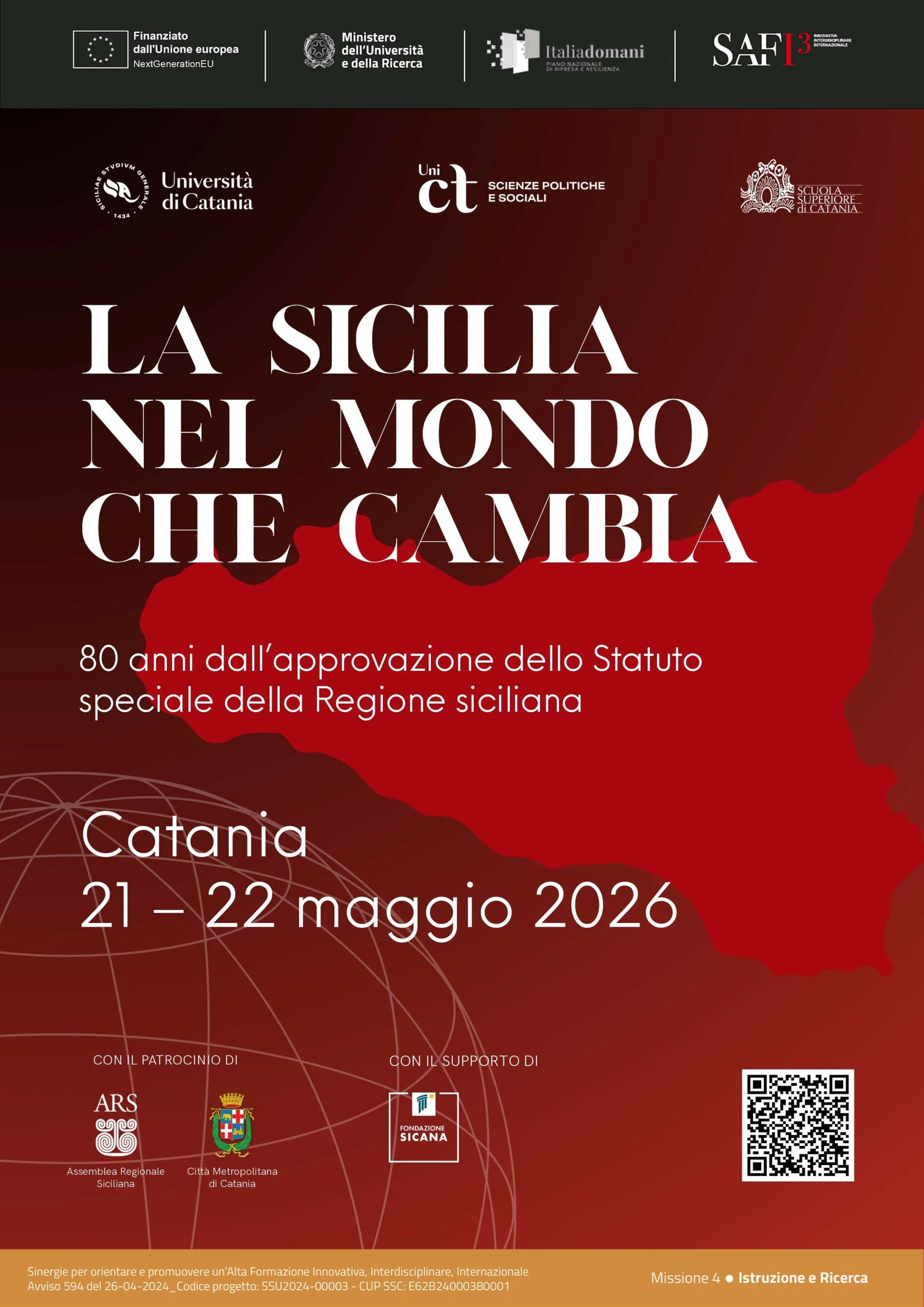 Il Dipartimento di Scienze Politiche e Sociali e la Scuola Superiore di Catania dell’Università di Catania organizzano, con la direzione scientifica dei professori Vincenzo Antonelli ed Ida Nicotra, nei giorni 21 e 22 maggio 2026 un convegno in occasione degli 80 anni dell’approvazione dello Statuto speciale della Regione siciliana.