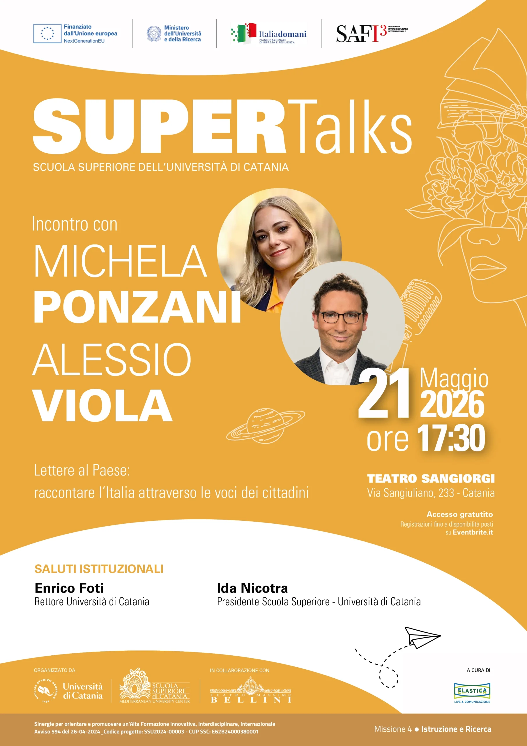 Si chiude il prossimo 21 maggio, SUPERTalks! il ciclo di incontri organizzati dalla Scuola Superiore di Catania: a salire sul palco del Teatro Sangiorgi alle 17.30 stavolta saranno due ospiti: la storica e divulgatrice Michela Ponzani e il giornalista di punta di SkyTg24 Alessio Viola che dialogheranno sul tema “Lettere al Paese: raccontare l’Italia attraverso le voci dei cittadini”.